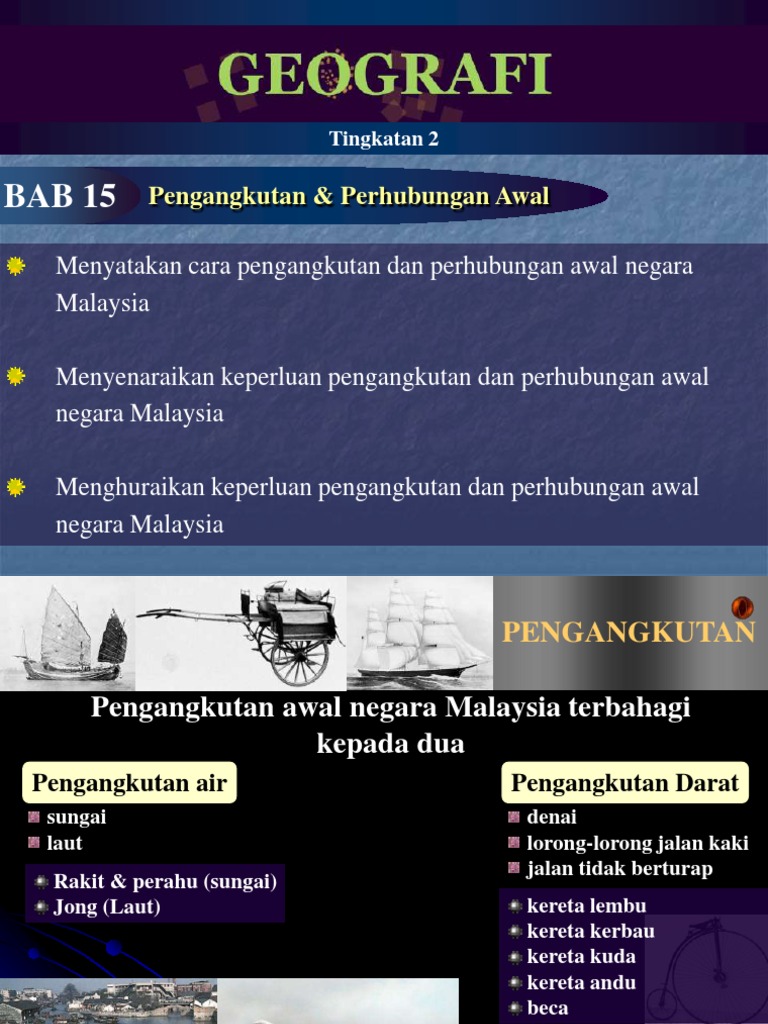 Pelayanan berkala artinya hubungan kerja antara pengirim dan pengangkut tidak bersifat tetap, hanya kadang kala saja bila pengirim. Pengangkutan awal sebelum zaman penjajahan. Merancak pelaburan awam dan swasta 51. *pengangkutan awal & perhubungan awal di negara malaysia *situasi sebelum penjajahan & selepas penjajahan *jalan raya pada masa british & penerangannya *jaringan once your powtoon is ready to be downloaded we'll send you an email. Dalam keadaan tertentu pesawat udara negara dapat dipergunakan untuk keperluan angkutan udara.